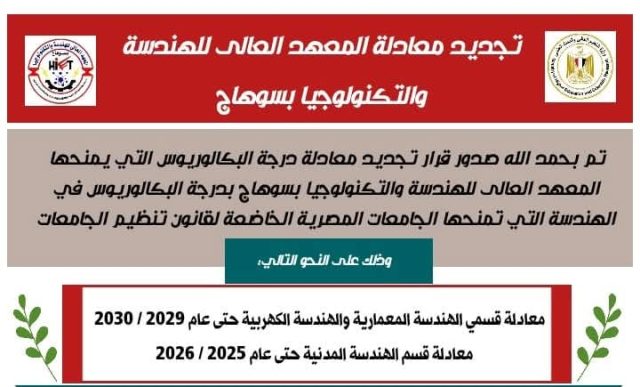 الرئيسية/اخبار المعهد/تجديد معادلة المعهد العالي للهندسة بسوهاج اخبار المعهد أخر الأخبار تجديد معادلة المعهد العالي للهندسة بسوهاج معادلة قسمي الهندسة المعمارية و الهندسة الكهربائية حتى عام2029-2030 معادلة قسم الهندسة المدنية حتى عام2025-2026 0 239 أقل من دقيقة فيسبوك تويتر لينكدإن 0 239 أقل من دقيقة فيسبوك تويتر لينكدإن شاركها فيسبوك تويتر لينكدإن طباعة